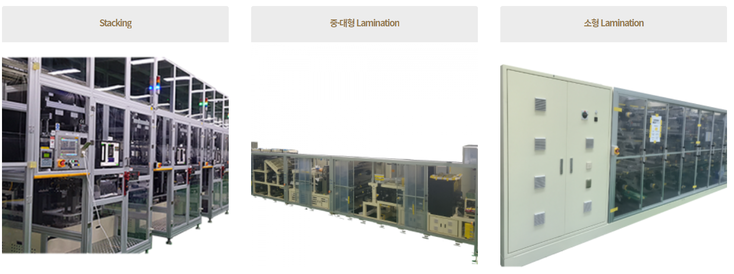 두 장비 모두 2차 전지 제조공정 중 조립공정에 특화된 장비로써 LG화학의 오창공장을 비롯하여 폴란드, 중국 공장에 납품하고 있습니다. Lamination & Stacking 기술은 LG화학, 삼성SDI, SK 이노베이션등이 모두 참석한 2019년 11월에 실시된 인터배터리 행사에서도 선보여진 기술로서 내부공간활용을 극대화해 최고 에너지 밀도를 구현할 수 있도록하는 제조기술입니다.