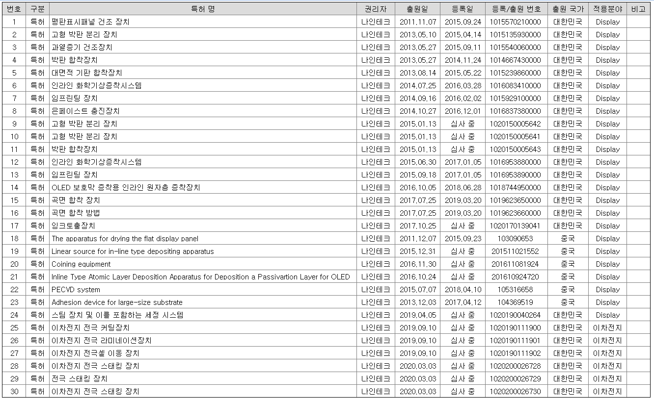 나인테크 사업보고서 상의 특허 내역만 보더라도 디스플레이 관련 특허가 압도적으로 많은 것도 그 이유입니다. 2차전지 관련 특허는 아직 모두 심사중에 있습니다. 2차전지 사업에 뛰어든지 얼마 안되었기 때문에 해당 산업에서의 노하우가 부족할 수도 있을 것으로 보여집니다. 이는 우려스러운 부분중 하나입니다.