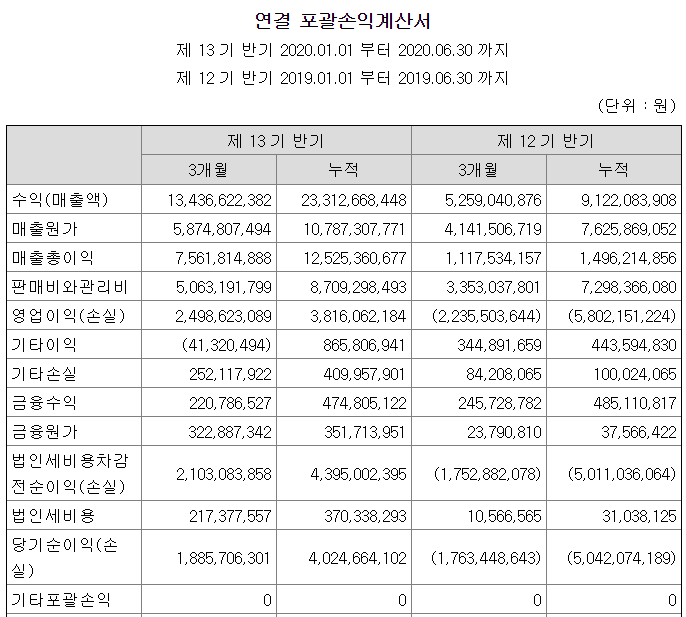 그리고 나머지 금액을 올해 매출로 잡으면서 올해 반기기준으로 흑자전환에 성공했습니다. 올해 남은 계약금 96억에 대해서는 비임상자료를 전달한 후에 받게될 것으로 보이며 이미 전달을 위한 송장을 발송한 상태이기 때문에 곧 인식하게 될 것으로 보여집니다.