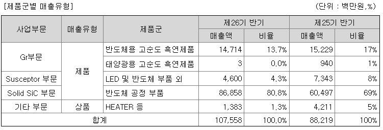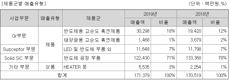 구체적 제품으로는 고순도 흑연을 이용한 반도체 및 태양전지용 실리콘 잉곳을 생산하는 Growing 장비용 Graphite 부품을 국내 최초로 국산화하여 제조, 판매하고 있으며, 반도체 Device업체에서 사용하는 장비의 Solid SiC Wafer, Ring 및 SIC 제품도 판매중에 있습니다.