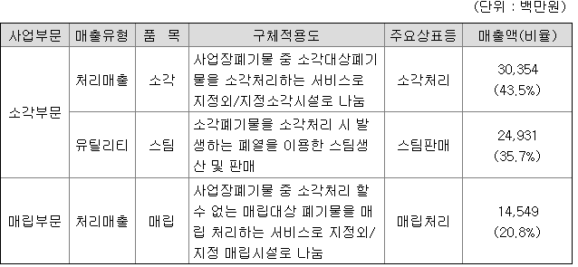 코엔텍은 각종 쓰레기, 폐기물 등을 수집/운반, 처리하는 산업 활동을 영위하고 있습니다. 또한 방사성 폐기물 수집/운반도 하고 있습니다. 아래에서 볼 수 있다시피 대부분의 매출이 폐기물처리활동에서 나오며 소각과정에서 나온 스팀 또한 판매하고 있습니다.