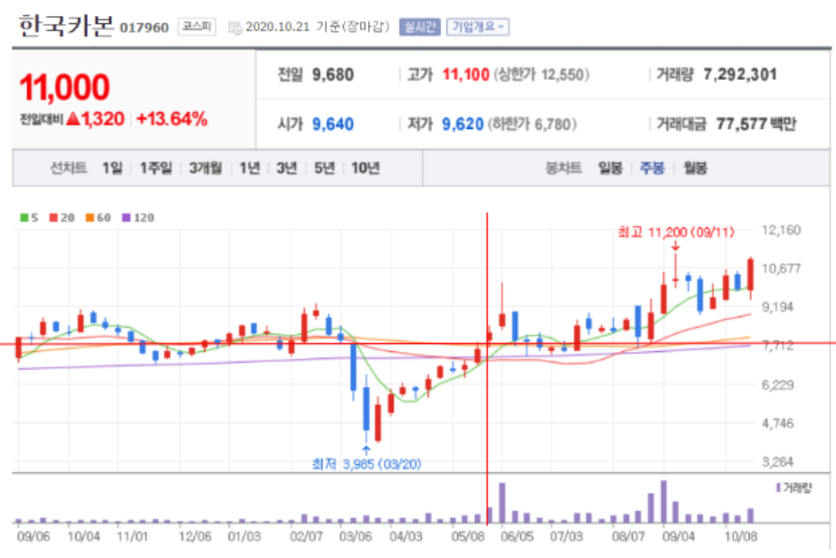 지난 2020년 5월 25일 한국카본의 사업분석 및 전망을 다룬 글을 기재한 적이 있습니다. 그 때 당시(5월 25일 종가기준) 한국카본의 주가는 7,770원이었습니다. 현재는 그 후 등락을 거듭한 후 11,000원에 형성되어있습니다.