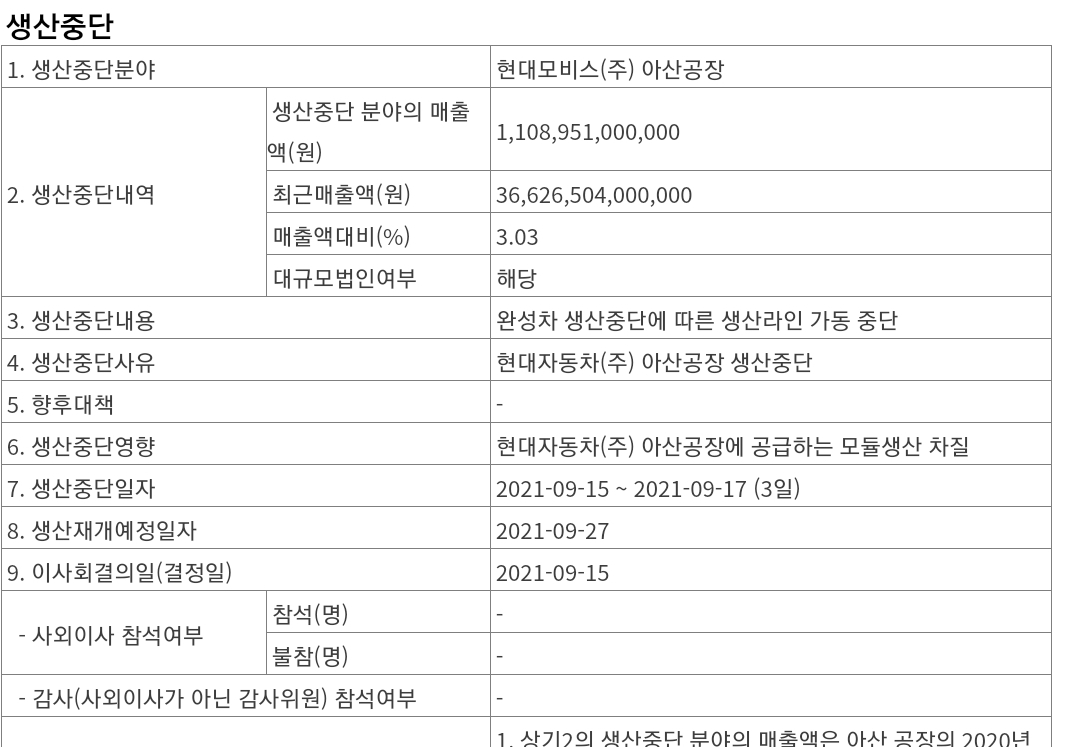 2021년 9월 15일 아산공장 현대모비스 생산중단 공시