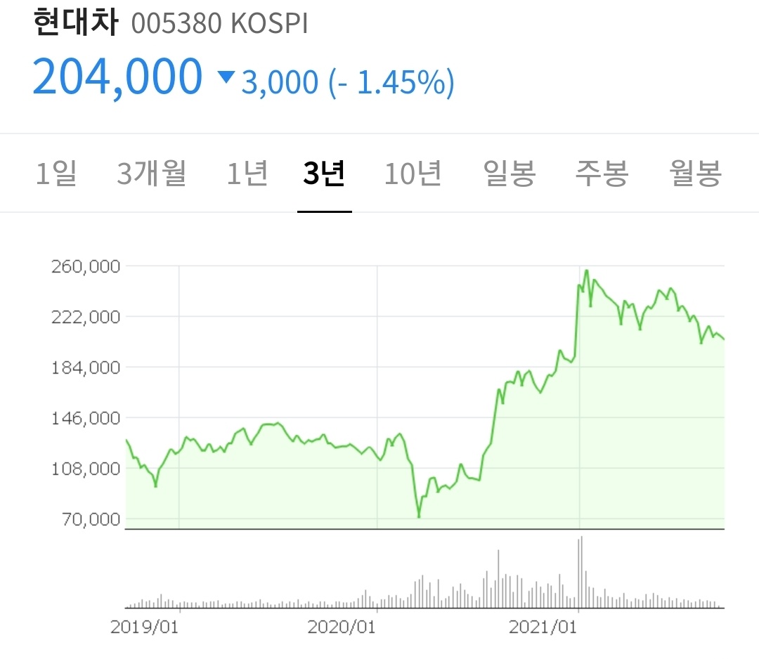 하지만 회사 자체의 문제가 아닌 특정 부품 혹은 원자재의 부족현상은 이전에도 있었고 다른회사에도 있었으며 그러한 부족현상은 항상 해결되어왔고 그러한 우려가 지나가면 주가는 연제그랬냐는 듯 다시 올라가는 패턴을 보여왔습니다. 이러한 우려가 극에 달했을 때 매수를 한다면 보다 높은 기대 수익률을 기대할 수 있고 주가는 보통 6개월 뒤를 먼저보고 선행하기 때문에 개인적인 의견으로는 이러한 차량용반도체 부족과 같은 상황을 오히려 우려하기 보단 기회로 삼아야 한다고 생각합니다.