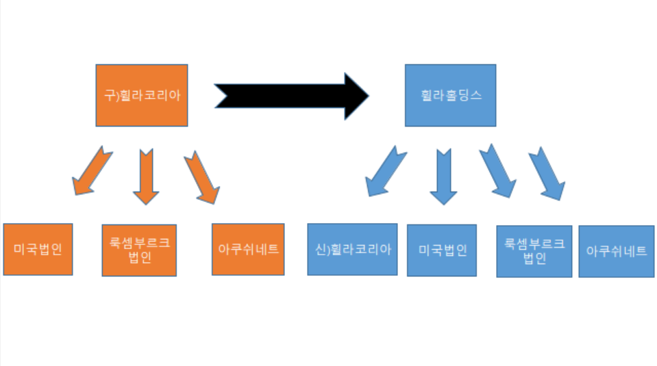 요약하면 구)휠라코리아가 관리회사인 홀딩스와 사업부서인 신)휠라코리아로 물적분할을 한 뒤에 신)휠라코리아가 홀딩스의 완전자회사로 들어가게되고 휠라홀딩스가 상장회사로 남은 것이다.