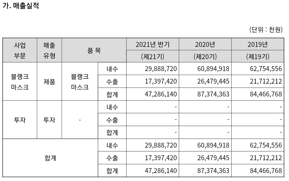 아래 매출 실적에서도 알 수 있다시피 현재는 블랭크마스크쪽에서 모든 매출이 발생하고 있습니다.