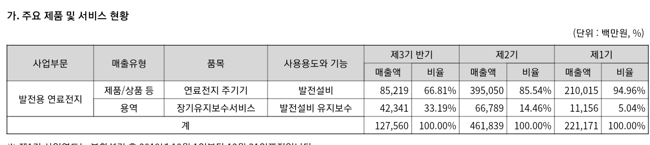 듀산퓨얼셀은 수소연료전지를 만드는 회사입니다. 쉽게 말하면 수소를 통한 발전을 할수 있는 설비를 만드는 회사이며 만든 설비를 정비하는 과정에서 한 번 더 수익이 발생합니다. 아래 두산퓨얼셀 사업보고서에서 알 수 있다시피 전체 매출액이 연료전지에서 발생하고 있습니다.